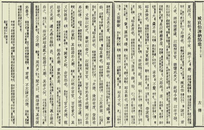 臧哀伯谏曰:“君人者,将昭德塞违,以临照百官(3);犹惧或失之,故昭令德以示子孙(4)。是以清庙茅屋(5),大路越[huó]席(6),大[tài]羹不致(7),粢[zī]食[sì]不凿[zuò](8),昭其俭也;衮[ɡǔn]冕黻[fú]珽[tǐnɡ](9),带裳[chánɡ]幅[bī]舄[xì](10),衡紞[dǎn]纮[hónɡ]綖[yán](11),昭其度也;藻率鞞[bǐnɡ]鞛[běnɡ](12),鞶[pán]厉游[liú]缨(13),昭其数也;火龙黼[fǔ]黻[fú](14),昭其文也;五色比象(15),昭其物也;钖[yánɡ]鸾和铃(16),昭其声也;三辰旂[qí]旗(17),昭其明也。夫德,俭而有度,登降有数(18)。文物以纪之,声明以发之,以临照百官,百官于是乎戒惧,而不敢易纪律。今灭德立违,而置其赂器于大庙,以明示百官。百官象之(19),其又何诛焉?国家之败,由官邪也;官之失德,宠赂章也。郜鼎在庙,章孰甚焉?(20)武王克商,迁九鼎(21)于雒[luò]邑(22),义士犹或非之,而况将昭违乱之赂器于大庙。其若之何?”公不听。