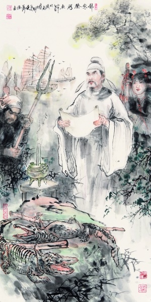 某年某月某日,潮州刺史韩愈派遣部下军事衙推秦济,把羊一头、猪一头,投入恶溪的潭水中,送给鳄鱼吃,同时又警告它:古时候的帝王拥 有天下后,放火焚烧山岭和泽地的草木,用绳索去网捉、用利刃去刺杀,以除灭虫、蛇等那些给人民带来危害的可恶动物,并把它们驱逐到四海之外去。到了后世, 帝王的德行威望不够,不能统治远方,于是,长江、汉水之间的大片土地只得放弃给东南各族;更何况潮州地处五岭和南海之间,离京城有万里之遥呢!鳄鱼之所以 潜伏、生息在此地,也就很自然了。
