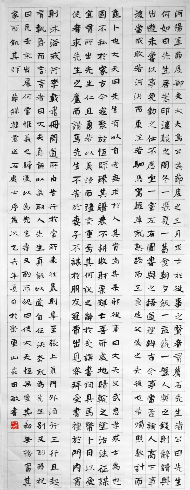 河阳军节度、御史大夫乌公,为节度之三月,求士于从事之贤者。有荐石先生者。公曰:“先生何如?”曰:“先生居嵩、邙、瀍、谷之间,冬一裘,夏一葛,食朝夕,饭一盂,蔬一盘。人与之钱,则辞;请与出游,未尝以事免;劝之仕,不应。坐一室,左右图书。与之语道理,辨古今事当否,论人高下,事后当成败,若河决下流而东注;若驷马驾轻车就熟路,而王良、造父为之先后也;若烛照、数计而龟卜也。”大夫曰:“先生有以自老,无求于人,其肯为某来邪?”从事曰:“大夫文武忠孝,求士为国,不私于家。方今寇聚于恒,师还其疆,农不耕收,财粟殚亡。吾所处地,归输之涂,治法征谋,宜有所出。先生仁且勇。若以义请而强委重焉,其何说之辞?”于是撰书词,具马币,卜日以受使者,求先生之庐而请焉。