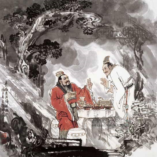 三国时,董承约刘备等立盟除曹。刘备恐曹操生疑,每天浇水种豆;曹操闻知后,设樽俎:盘置青梅,一樽煮酒。二人对坐,开怀畅饮。议论天下英雄。当曹操说“天下英雄,唯使君与操耳”,刘备闻之大惊失箸。风和日丽的天气突然雷雨大作,刘备以胆小、怕雷掩饰而使曹操释疑,并请征剿袁术、此时关羽张飞赶到,乃借以脱身。曹操当时是以试探的心理来设宴的,而刘备则诚惶诚恐,希望不要引起曹操的怀疑。