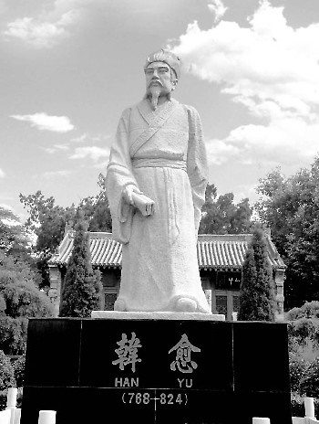 韩愈(768~824)字退之,唐代文学家、哲学家、思想家,河阳(今河南省焦作孟州市)人,汉族。祖籍河北昌黎,世称韩昌黎。晚年任吏部侍郎,又称韩吏部。谥号“文”,又称韩文公。他与柳宗元同为唐代古文运动的倡导者,主张学习先秦两汉的散文语言,破骈为散,扩大文言文的表达功能。宋代苏轼称他“文起八代之衰”,明人推他为唐宋八大家之首,与柳宗元并称“韩柳”,有“文章巨公”和“百代文宗”之名,作品都收在《昌黎先生集》里。韩愈在思想上是中国“道统”观念的确立者,是尊儒反佛的里程碑式人物。