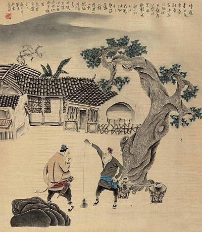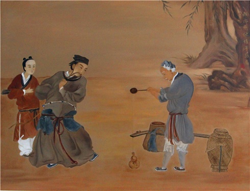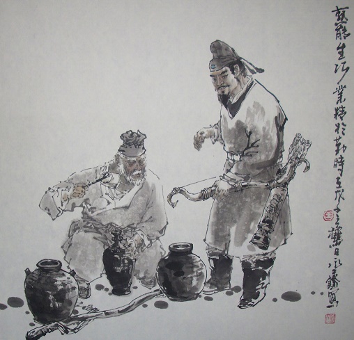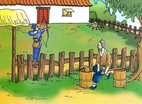 康肃问曰:”汝(rǔ)亦知射乎?吾射不亦精乎?”翁曰:”无他, 但手熟(shú)尔。”康肃忿(fèn)然曰:”尔安敢轻吾射!”翁曰:”以我酌(zhuó)油知之。”乃取一葫芦置于地,以钱覆其口,徐以杓(sháo)酌油沥(lì)之,自钱孔入,而钱不湿。因曰:”我亦无他,唯手熟(shú)尔。”康肃笑而遣(qiǎn)之。