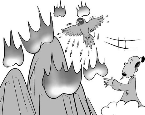 鹦鹉回答:”我虽然知道一点点的水不能救它们.但是我曾经寄居在这座山, 飞禽走兽友好地对待我如同兄弟, 我不忍心看见它们被大火烧死!”