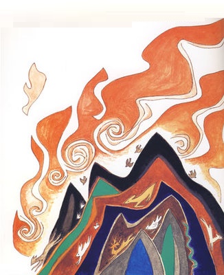 几个月后, 山中起大火, 鹦鹉远远地看见, 便进入水中沾湿羽毛,飞过去并洒向山那里。