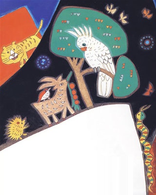 有鹦鹉飞到其它山栖息, 山中的飞禽走兽总是都很尊重地对待鹦鹉。鹦鹉自己想: 待在这山里虽然快乐,但不可长时间居住在这里,就离开了。
