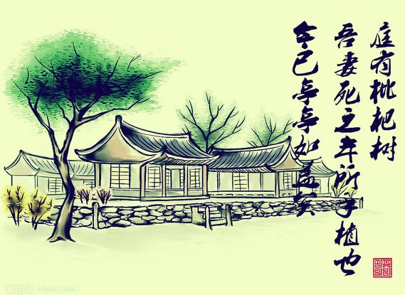 再如写祖母的一段文字,简洁细腻,绘声传神,“大类女郎”,“儿之成,则可待乎”一两句话;“比去,以手阖门”,“顷之,持一象笏至”一两个动作,把老年人对孙子的牵挂、赞许、鞭策的复杂感情,描绘的惟妙惟肖。写亡妻,只说:“时至轩中,从余问古事,或凭几学书。”寥寥数笔,绘出了夫妻之间的一片深情。末尾,作者把极深的悲痛寄寓一棵枇杷树。“庭有枇杷树,吾妻死之年所手植也,今已亭亭如盖矣。”枇杷树本来是无思想感情的静物,但把它的种植时间与妻子逝世之年联系起来,移情于物;在“亭亭如盖”四个字的前面加上“今已”这个时间词,表明时光在推移,静物也显示着动态。树长,人亡!物是,人非!光阴易逝,情意难忘。由于想念人而触及与人有一定关系的物,便更添了对人的思念;再由对物的联想,又引发对往事的伤怀。于是托物寄情,物我交融,进一步把思念之情深化了。只说树在生长,不说人在思念,它所产生的艺术效果则是:不言情而情无限,言有尽而意无穷。