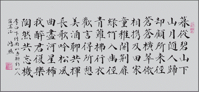 从诗的内容看,诗人是在月夜到长安南面的终南山去造访一位姓斛斯的隐士。首句“暮从碧山下”,“暮”字挑起了第二句的“山月”和第四句的“苍苍”,“下”字挑起了第二句的“随人归”和第三句的“却顾”,“碧”字又逗出第四句的“翠微”。平平常常五个字,却无一字虚设。“山月随人归”,把月写得如此脉脉有情。月尚如此,人则可知。第三句“却顾所来径”,写出诗人对终南山的余情。这里虽未正面写山林暮景,却是情中有景。正是旖旎山色,使诗人迷恋不已。第四句又是正面描写。“翠微”指青翠掩映的山林幽深处。“苍苍”两字起加倍渲染的作用。“横”有笼罩意。此句描绘出暮色苍苍中的山林美景。这四句,用笔简炼而神色俱佳。诗人漫步山径,大概遇到了斛斯山人,于是“相携及田家”,“相携”,显出情谊的密切。“童稚开荆扉”,连孩子们也开柴门来迎客了。进门后,“绿竹入幽径,青萝拂行衣”,写出了田家庭园的恬静,流露出诗人的称羡之情。“欢言得所憩,美酒聊共挥”,“得所憩”不仅是赞美山人的庭园居室,也为遇知己而高兴。因而欢言笑谈,美酒共挥。一个“挥”字写出了李白畅怀豪饮的神情。酒醉情浓,放声长歌,直唱到天河群星疏落,籁寂更深。“长歌吟松风,曲尽河星稀”句中青松与青天,仍处处绾带上文的一片苍翠。至于河星既稀,月色自淡,这就不在话下了。最后,从美酒共挥,转到“我醉君复乐,陶然共忘机”,写出酒后的风味,陶陶然把人世的机巧之心,一扫而空,显得淡泊而恬远。