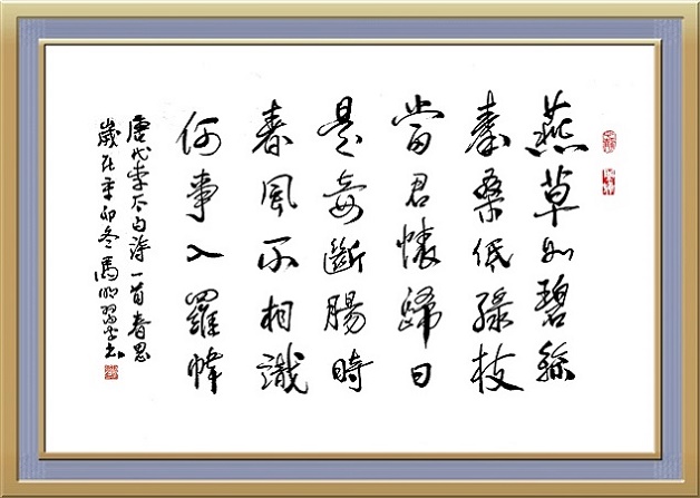 燕草如碧丝,秦桑低绿枝。出自唐代诗人李白作品《春思》。此诗写一位出征军人的妻子在明媚的春日里对丈夫梦绕魂牵的思念,以及对战争早日胜利的盼望,表现思妇的思边之苦及其对爱情的坚贞。全诗言辞朴实无华,情景交融,神骨气味高雅浑然,富有民歌特色。