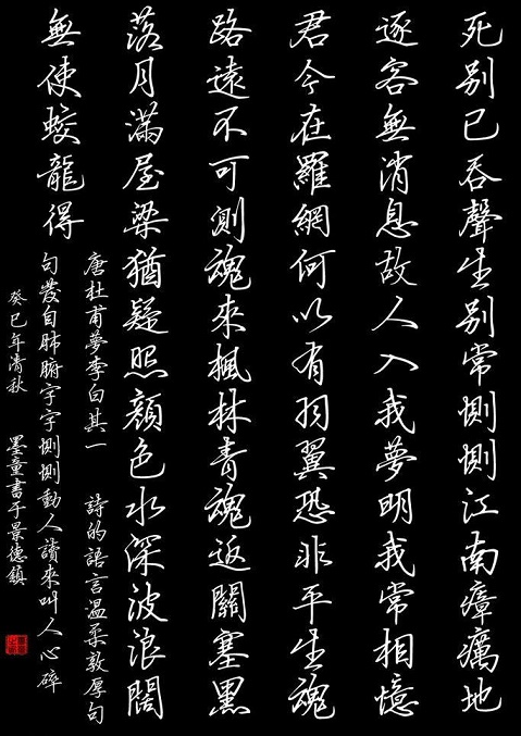 “魂来枫林青,魂返关塞黑。”梦归魂去,诗人依然思量不已:故人魂魄,星夜从江南而来,又星夜自秦州而返,来时要飞越南方青郁郁的千里枫林,归去要渡过秦陇黑沉沉的万丈关塞,多么遥远,多么艰辛,而且是孤零零的一个。“落月满屋梁,犹疑照颜色。”在满屋明晃晃的月光里面,诗人忽又觉得李白那憔悴的容颜依稀尚在,凝神细辨,才知是一种朦胧的错觉。相到故人魂魄一路归去,夜又深,路又远,江湖之间,风涛险恶,诗人内心祝告着、叮咛着:“水深波浪阔,无使蛟龙得。”这惊骇可怖的景象,正好是李白险恶处境的象征,这惴惴不安的祈祷,体现着诗人对故人命运的殷忧。这里,用了两处有关屈原的典故。“魂来枫林青”,出自《楚辞·招魂》:“湛湛江水兮上有枫,目极千里兮伤春心,魂兮归来哀江南!”旧说系宋玉为招屈原之魂而作。“蛟龙”一语见于梁吴均《续齐谐记》:东汉初年,有人在长沙见到一个自称屈原的人,听他说:“吾尝见祭甚盛,然为蛟龙所苦。”通过用典将李白与屈原联系起来,不但突出了李白命运的悲剧色彩,而且表示着杜甫对李白的称许和崇敬。