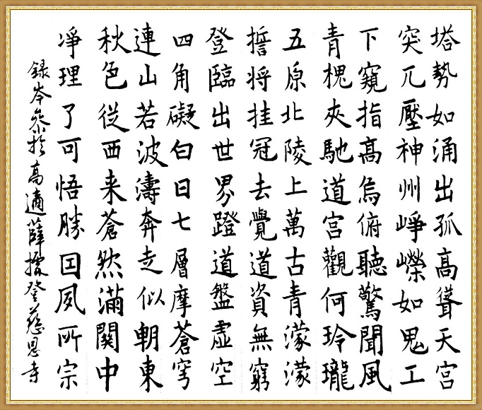 接下去四句:“登临出世界,磴道盘虚空。突兀压神州,峥嵘如鬼工。”写登临所见、所感,到了塔身,拾级而上,如同走进广阔无垠的宇宙,蜿蜒的石阶,盘旋而上,直达天穹。此时再看宝塔,突兀耸立,如神工鬼斧,简直不敢相信人力所及。慈恩寺塔,不仅雄伟,而且精妙。