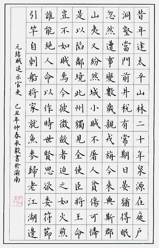 元结在政治上是一位具有仁政爱民理想的清正官吏;在文学上反对“拘限声病,喜尚形似”(《箧中集序》)的浮艳诗风,主张发挥文学“救时劝俗”(《文编序》)的社会作用。这首诗不论叙事抒情,都指陈事实,直抒胸臆,没有一点雕琢矫饰的痕迹,而诗中那种忧时爱民的深挚感情,如从胸中自然倾泄,自有一种感人之处,亦自能在质朴之中成其浑厚,显示出元结诗质朴简古、平直切正的典型特色。沈德潜说:“次山诗自写胸次,不欲规模古人,而奇响逸趣,在唐人中另辟门径。”(《唐诗别裁》)