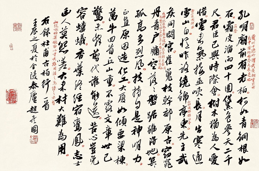 如果说前八联还只是在赞赏武侯的同时暗含着诗人对自己境遇的悲哀和感叹,那么后四联八句则在曲尽体物之妙的基础上直抒胸臆,将古柏与自己紧紧连在一起,句句写古柏,又句句写自己,淋漓尽致地抒发了诗人材大难用的愤慨。以大厦将倾暗喻国家的危机,正是需要人才的时候。然而大木重于丘山,万牛都因不能拉动而回首去看,暗指国家危亡之际贤能却得不到任用,这与武侯和刘备的君臣际会正是天壤之别。