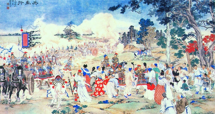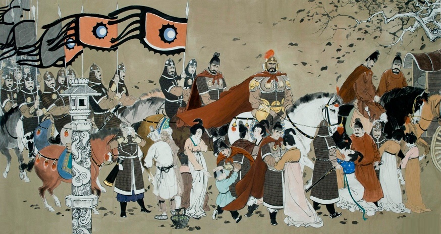 大路上车轮滚滚战马嘶叫,出征的青年弓箭挂在腰间。