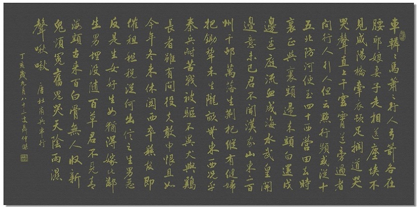 诗歌从蓦然而起的客观描述开始,以重墨铺染的雄浑笔法,如风至潮来,突兀展现出一幅震人心弦的巨幅送别图:兵车隆隆,战马嘶鸣,一队队被抓来的穷苦百姓,换上了戎装,佩上了弓箭,在官吏的押送下,正开往前线。征夫的爷娘妻子乱纷纷地在队伍中寻找、呼喊自己的亲人,扯着亲人的衣衫,捶胸顿足,边叮咛边呼号。车马扬起的灰尘,遮天蔽日,连咸阳西北横跨渭水的大桥都被遮没了。千万人的哭声汇成震天的巨响在云际回荡。“耶娘妻子走相送”,一个家庭支柱、主要劳动力被抓走了,剩下来的尽是些老弱妇幼,对一个家庭来说不啻是一个塌天大祸,自然是扶老携幼,奔走相送。一个普通的“走”字,寄寓了诗人非常浓厚的感情色彩。亲人被突然抓兵,又急促押送出征,眷属们追奔呼号,去作那一刹那的生死离别,很仓促,也非常悲愤。“牵衣顿足拦道哭”,一句之中连续四个动作,又把送行者那种眷恋、悲怆、愤恨、绝望的动作神态,表现得细腻入微。诗人笔下,车马人流,灰尘弥漫;哭声遍野,直冲云天。这样的描写,从听觉和视觉上表现生死离别的悲惨场面,集中展现了成千上万家庭妻离子散的悲剧。