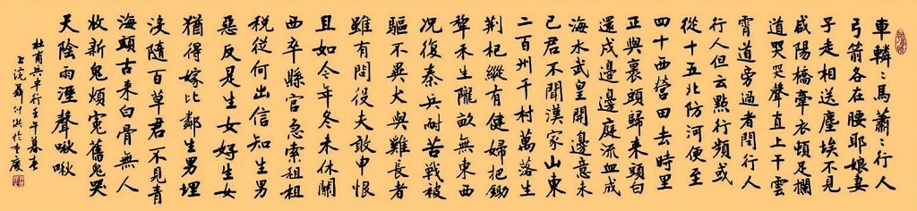 长者虽有问,役夫敢申恨?出自唐代诗人杜甫作品《兵车行》。全诗以“道旁过者问行人”为界分为两段:首段摹写送别的惨状,是纪事;次段传达征夫的诉苦,是纪言。此诗具有深刻的思想内容,借征夫对老人的答话,倾诉了人民对战争的痛恨,揭露了唐玄宗长期以来的穷兵黩武,连年征战,给人民造成了巨大的灾难。全诗寓情于叙事之中,在叙述次序上参差错落前后呼应,变化开阖井然有序,并巧妙运用过渡句和习用词语,造成了回肠荡气的艺术效果。诗人自创乐府新题写时事,为中唐时期兴起的新乐府运动作出了开创性的贡献。