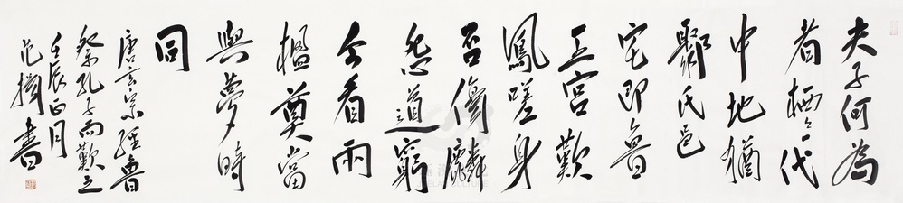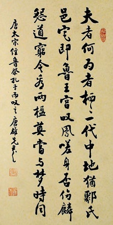 颈联是孔子的自伤之词,也是借用典故,借孔子自叹命运不济,生不逢时,政治理想难以实现,真实再现了孔子当年孤寂,凄凉的心境。《论语·子罕》中载:“子曰:‘凤鸟不至,河不出图,吾已矣夫!”传说凤凰现身,河洛图出,是象征圣王出世的瑞兆,然而孔子生逢春秋乱世,刀兵四起。诸侯们只关心自己的领土、霸权、兵力,没有肯行仁义的圣王,因此孔子自叹儒学之道没有用武之地,而自己这些致力于推行德政的人也如那只被愚人猎捕的麒麟一般,早晚要被这个穷兵黜武的时代所绞杀。“嗟身否”感怀身世,“伤麟怨”则叹息王道难行。这些都足以唤起了人们对孔子的深深同情和深切的感慨。也表明作者决意推行仁政,以告慰孔子泉下亡灵。