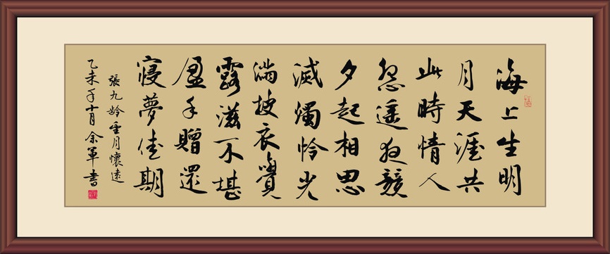 《望月怀远》是一首月夜怀念远人的诗,是作者在离乡时,望月而思念远方亲人而写的。起句“海上生明月”意境雄浑阔大,是千古佳句。它和谢灵运的“池塘生春草”、“明月照积雪”,谢朓的“大江流日夜”以及作者自己的“孤鸿海上来”等名句一样,看起来平淡无奇,没有一个奇特的字眼,没有一分点染的色彩,脱口而出,却自然具有一种高华浑融的气象。这一句完全是景,点明题中的“望月”。第二句“天涯共此时”,即由景入情,转入“怀远”。前乎此的有谢庄《月赋》中的“隔千里兮共明月”,后乎此的有苏轼《水调歌头·明月几时有》词中的“但愿人长久,千里共婵娟”,都是写月的名句,其旨意也大抵相同,但由于各人以不同的表现方法,表现在不同的体裁中,谢庄是赋,苏轼是词,张九龄是诗,相体裁衣,各极其妙。这两句把诗题的情景,一起就全部收摄,却又毫不费力,仍是张九龄作古诗时浑成自然的风格。
