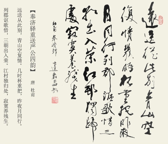 奉济驿,在成都东北的绵阳县。严公,即严武,曾两度为剑南节度使。762年(宝应元年)四月,唐肃宗死,唐代宗即位,六月,召严武入朝,杜甫送别赠诗,因之前已写过《送严侍郎到绵州同登杜使君江楼宴》,故称“重送”。律诗双句押韵,八句诗四个韵脚,故称“四韵”。严武有文才武略,品性与杜甫相投。镇蜀期间,亲到草堂探视杜甫,并在经济上给予接济;彼此赠诗,相互敬重,结下了深厚的友谊。