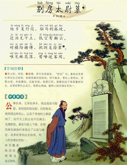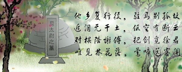 “他乡复行役,驻马别孤坟。”既在他乡复值行役之中,公事在身,行色匆匆。尽管如此,诗人还是驻马暂留,来到孤坟前,向亡友致哀。先前堂堂宰相之墓,如今已是茕茕“孤坟”,表现了房琯晚年的坎坷和身后的凄凉。