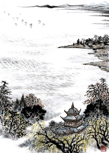 首联“昔闻洞庭水,今上岳阳楼”。有一点是很清楚的,诗人对洞庭湖向往已久,这是在叙事写景的行文中,自然地流露出来的感情。但这毕竟是过去的向往,登上了岳阳楼,其感情似乎应当是高兴。因为多年的向往实现了,一定高兴。但仔细品味,句中又见不到高兴的字眼,抽不出如愿以偿的情思。联系下文更是如此。实际上在这两句中“昔”与“今”之间,是一段漫长的时间距离,作者把这段距离拉开,没有用简单的“喜”“悲”之词来填充它,而是留给读者去想象、回味。古人说“律诗之妙全在无字处”,这里就是无字处。“昔”与“今”之间,天在变,地在变,国在变,人也在变。安史之乱,唐王朝由盛转衰,人民的深重灾难,杜甫个人的悲惨遭遇,这一切都凝聚在一起,凝聚在杜甫的心头,并随着诗人—起登上了岳阳楼。他高兴不起来。应当说“今上岳阳楼”是向往了多年不得登,如今才算是登上来了,这是一声长叹,长叹的内里是一团忧国忧民、伤时伤世的感慨。这一声长叹,就像那咏叹调的引子,开启了下面一个个乐章。这里还要注意到一个“水”字,题目是“登岳阳楼”,头一句却先写洞庭湖,第二句才写岳阳楼,而且是“洞庭水”不是洞庭湖。这个“水”字显然是要突出的,这是抓住了洞庭风光的主要特点,说明了下文主要是在“水”上做文章。