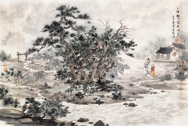 首、颈两联,以寒山、秋水、落日、孤烟等富有季节和时间特征的景物,构成一幅和谐静谧的山水田园风景画。但这风景并非单纯的孤立的客观存在,而是画在人眼里,人在画图中,一景一物都经过诗人主观的过滤而带上了感情色彩。颔联:“倚杖柴门外,临风听暮蝉。”这就是诗人的形象。柴门,表现隐居生活和田园风味;倚杖,表现年事已高和意态安闲。柴门之外,倚杖临风,听晚树鸣蝉、寒山泉水,看渡头落日、墟里孤烟,那安逸的神态,潇洒的闲情,和“策扶老以流憩,时矫首而遐观”(《归去来辞》)的陶渊明有几分相似。事实上,王维对那位“古今隐逸诗人之宗”,也是十分仰慕的,就在这首诗中,不仅仿效了陶的诗句,而且在尾联引用了陶的典故:“复值接舆醉,狂歌五柳前。”陶文《五柳先生传》的主人公,是一位忘怀得失、诗酒自娱的隐者,“宅边有五柳树,因以为号焉。”实则,生正是陶潜的自我写照;而王维自称五柳,就是以陶潜自况的。接舆,是春秋时代“凤歌笑孔丘”的楚国狂士,诗人把沉醉狂歌的裴迪与楚狂接舆相比,乃是对这位年轻朋友的赞许。陶潜与接舆──王维与裴迪,个性虽大不一样,但那超然物外的心迹却是相近相亲的。所以,“复值接舆醉”的复字,不表示又一次遇见裴迪,而是表示诗人情感的加倍和进层:既赏佳景,更遇良朋,辋川闲居之乐,至于此极啊!末联生动地刻画了裴迪的狂士形象,表明了诗人对他的由衷的好感和欢迎,诗题中的赠字,也便有了着落。