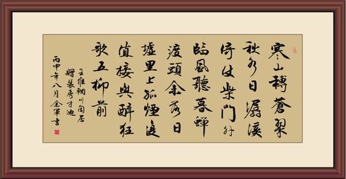 此诗、画、音乐完美结合的五律。首联和颈联写景,描绘辋川附近山水田园的深秋暮色;颔联和尾联写人,刻画诗人和裴迪两个隐士的形象。风光人物,交替行文,相映成趣,形成物我一体、情景交融的艺术境界,抒写诗人的闲居之乐和对友人的真切情谊。