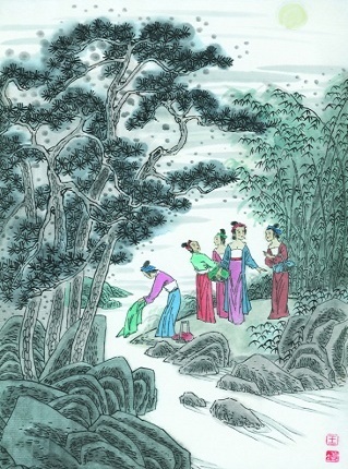 竹喧归浣女,莲动下渔舟。出自唐代诗人王维作品《山居秋暝》。此诗描绘了秋雨初晴后傍晚时分山村的旖旎风光和山居村民的淳朴风尚,表现了诗人寄情山水田园并对隐居生活怡然自得的满足心情,以自然美来表现人格美和社会美。全诗将空山雨后的秋凉,松间明月的光照,石上清泉的声音以及浣女归来竹林中的喧笑声,渔船穿过荷花的动态,和谐完美地融合在一起,给人一种丰富新鲜的感受。它像一幅清新秀丽的山水画,又像一支恬静优美的抒情乐曲,体现了王维诗中有画的创作特点。
