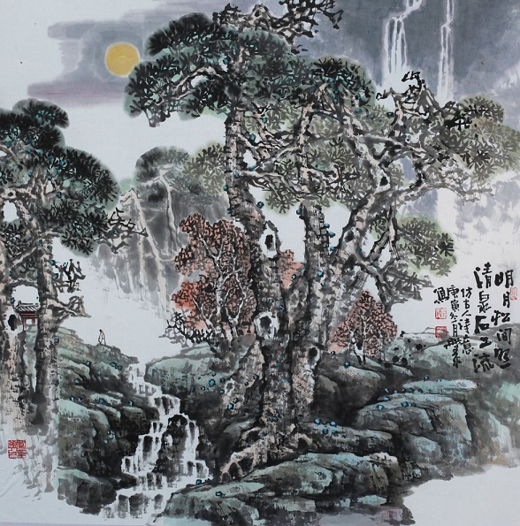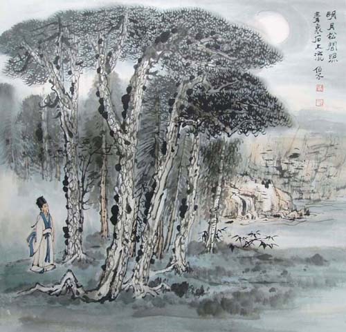 “明月松间照,清泉石上流。”天色已暝,却有皓月当空;群芳已谢,却有青松如盖。山泉清冽,淙淙流泻于山石之上,有如一条洁白无瑕的素练,在月光下闪闪发光,生动表现了幽清明净的自然美。王维的《济上四贤咏》曾经赞叹两位贤士的高尚情操,谓其“息阴无恶木,饮水必清源”。诗人自己也是这种心志高洁的人,他曾说:“宁息野树林,宁饮涧水流,不用坐梁肉,崎岖见王侯。”(《献始兴公》)这月下青松和石上清泉,正是他所追求的理想境界。这两句写景如画,随意洒脱,毫不着力。像这样又动人又自然的写景,达到了艺术上炉火纯青的地步,的确非一般人所能学到。