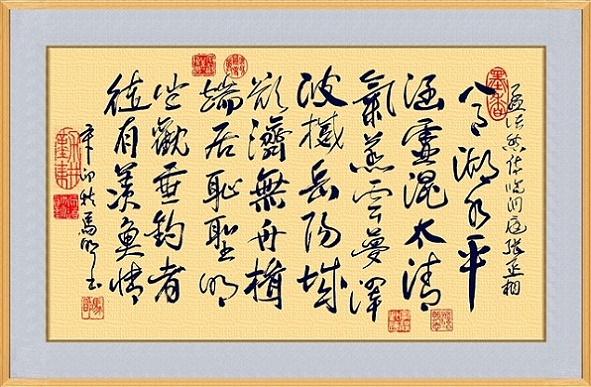 开头两句交代了时间,写出了浩瀚的湖水。湖水和天空浑然一体,景象是阔大的。“涵”,有包含的意思。“虚”,指高空。高空为水所包含,即天倒映在水里。“太清”指天空。“混太清”即水天相接。这两句是写站在湖边,远眺湖面的景色。三四两句继续写湖的广阔,但目光又由远而近,从湖面写到湖中倒映的景物:笼罩在湖上的水气蒸腾,吞没了云、梦二泽,“云、梦”是古代两个湖泽的名称,据说云泽在江北,梦泽在江南,后来大部分都淤成陆地。“撼”,摇动(动词,生动形象)。“岳阳城”,在洞庭湖东北岸,即今湖南岳阳市。西南风起时,波涛奔腾,涌向东北岸,好像要摇动岳阳城似的。“气蒸云梦泽,波撼岳阳城”(有的版本作“气吞云梦泽”),读到这里很自然地会联想起王维的诗句:“郡邑浮前浦,波澜动远空”。整个城市都飘浮在水面上,微风吹起层层波澜,遥远的天空都在水中晃动。它们真有异曲同工之妙。