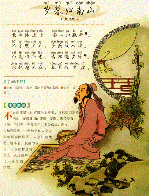 ⑴岁暮:年终。南山:唐人诗歌中常以南山代指隐居题。这里指作者家乡的岘山。一说指终南山。