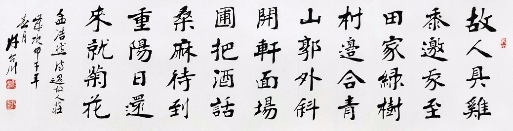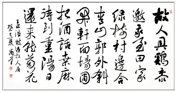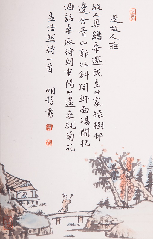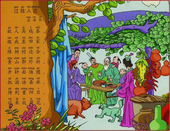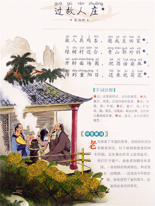 绿树村边合,青山郭外斜。出自唐代诗人孟浩然作品《过故人庄》,写的是诗人应邀到一位农村老朋友家做客的经过。在淳朴自然的田园风光之中,主客举杯饮酒,闲谈家常,充满了乐趣,抒发了诗人和朋友之间真挚的友情。这首诗初看似乎平淡如水,细细品味就像是一幅画着田园风光的中国画,将景、事、情完美地结合在一起,具有强烈的艺术感染力。