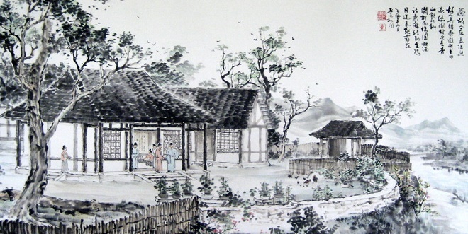 “开轩面场圃,把酒话桑麻”,才更显得畅快。这里“开轩”二字也似乎是很不经意地写入诗的,但上面两句写的是村庄的外景,此处叙述人在屋里饮酒交谈,轩窗一开,就让外景映入了户内,更给人以心旷神怡之感。对于这两句,人们比较注意“话桑麻”,认为是“相见无杂言”(陶渊明《归园田居》)。但有了轩窗前的一片打谷场和菜圃,在绿阴环抱之中,又给人以宽敞、舒展的感觉。话桑麻,就更让读者感到是田园。于是,读者不仅能领略到更强烈的农村风味、劳动生产的气息,甚至仿佛可以嗅到场圃上的泥土味,看到庄稼的成长和收获,乃至地区和季节的特征。有这两句和前两句的结合,绿树、青山、村舍、场圃、桑麻和谐地打成一片,构成一幅优美宁静的田园风景画,而宾主的欢笑和关于桑麻的话语,都仿佛萦绕在读者耳边。它不同于纯然幻想的桃花源,而是更富有盛唐社会的现实色采。正是在这样一个天地里,这位曾经慨叹过“当路谁相假,知音世所稀”的诗人,不仅把政治追求中所遇到的挫折,把名利得失忘却了,就连隐居中孤独抑郁的情绪也丢开了。从他对青山绿树的顾盼、与朋友对酒而共话桑麻中可以看出,他的思绪舒展了,甚至连他的举措都灵活自在了。农庄的环境和气氛,在这里显示了它的征服力,使得孟浩然有几分皈依了。