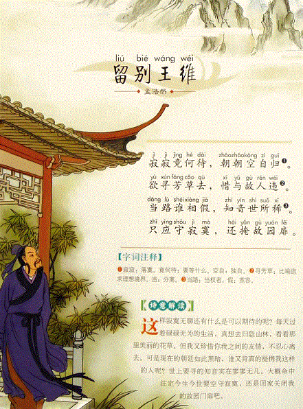 第二联写惜别之情。“芳草”一词,源自《离骚》,王逸认为用以比喻忠贞,而孟浩然则用以代表自己归隐的理想。“欲寻芳草去”,表明他又考虑归隐了。“惜与故人违”,表明了他同王维友情的深厚。一个“欲”字,一个“惜”字,充分地显示出作者思想上的矛盾与斗争,从这个思想活动里,却深刻地反映出作者的惜别之情。