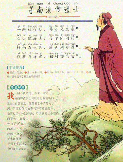 过雨看松色,随山到水源。出自唐代诗人刘长卿作品《寻南溪常山道人隐居》。此诗写寻隐者不遇,却得到别的情趣,领悟到“禅意”之妙处,通过写道士所居环境的静穆清幽,衬托了道士的超尘雅洁。全诗之意在于情与景,情景交融,结构严密紧凑,层层扣紧主题,风格自然清新。