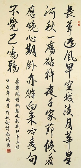 修长的竹枝早早迎接着秋风,淡淡的月华洒满了空城。一只鸿雁向银河飞去,寂静的夜里,传来千家万户捣衣的砧声。季节飞快地推移,转眼已秋冬,闲散里,我空怀着未曾了却的心意。我反复吟诵你秀美的诗句,不觉天色将晓,已听见早鸦乱啼。