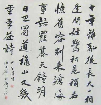 首联“十年离乱后,长大一相逢”,开门见山,介绍二人相逢的背景。这里有三层意思:一是指出离别已有十年之久。二是说明这是社会动乱中的离别。它使人想起,发生于李益八岁到十六岁时的安史之乱及其后的藩镇混战、外族入侵等战乱。三是说二人分手于幼年,“长大”才会面,这意味着双方的容貌已有极大变化。他们长期音信阻隔,存亡未卜,突然相逢,颇出意外。句中“一”字,表现出这次重逢的戏剧性。