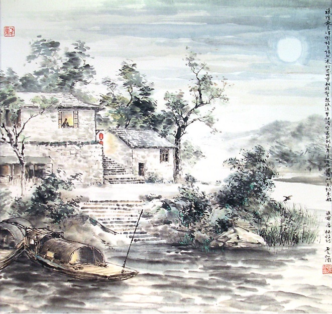 尾联合,收拢有力,却并非直抒胸意,而是以设想之词,勾勒家乡美丽的生活图景,融情于景,借景抒情,把浓烈的归思之情融入家乡优美的风景之中。沧江烟霭,云霞明灭,月色溶溶,家门外系着钓鱼船,一幅优美宁静祥和的家乡风光图景。画面中虽然没有写人物,但一条静静地系于家门外的钓鱼船却让人产生丰富的联想。面对这样一幅家乡优美的画面,谁人不梦绕魂牵,更何况旅宿在外的诗人呢!家乡远隔千里,旅人归思难收,如此优美的家乡风光图景非但没有给诗人以慰藉,反而加深了诗人的思乡愁苦。这是用乐景反衬哀情的典型。美景幽思、怨恨乡愁、委实凄绝。除却个中人,任何人也难以深味个中情。不过,“烟月”在此实际上是借代,并非一定就是“烟”,就是“月”。正所谓,文学作品的形象大于思维,此处一个“烟月”可以触发不同的旅人思妇产生不同的意象联想,从而产生强大的艺术感染力。