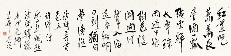 然而诗人没有久久沉湎在离愁别苦之中。中间四句笔势陡转,大笔勾画四周景色,雄浑苍茫,全是潼关的典型风物。骋目远望,南面是主峰高耸的西岳华山;北面,隔着黄河,又可见连绵苍莽的中条山。残云归岫,意味着天将放晴;疏雨乍过,给人一种清新之感。从写景看,诗人拿“残云”再加“归”字来点染华山,又拿“疏雨”再加“过”字来烘托中条山,这样,太华和中条就不是死景而是活景,因为其中有动势——在浩茫无际的沉静中显出了一抹飞动的意趣。