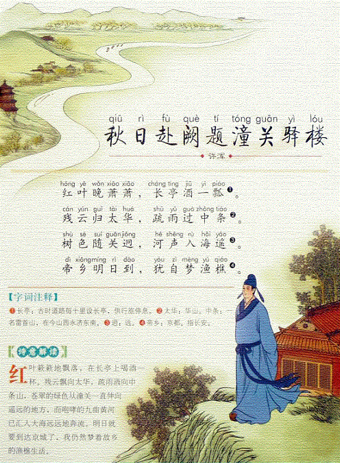 帝乡明日到,犹自梦渔樵。出自唐代诗人许浑作品《秋日赴阙题潼关驿楼》。此诗开头两句勾勒出一幅秋日行旅图,透露出悲凉的意绪,传达出旅途的况味;中间四句大笔勾画四周景色,雄浑苍茫,全是潼关的典型风物;最后两句含蓄地表白了自己的意趣。