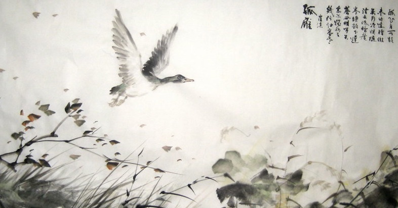 为了突出孤雁,首先要写出“离群”这个背景。所以诗人一开头便说:“几行归塞尽,念尔独何之?”站在驿楼上,极目远望,群雁不见了,只留下一只孤雁,在低空盘旋。从“归塞”二字,可以看出雁群是在向北,且又是在春天;因为只有在春分以后,鸿雁才飞回塞外。这两句中,一个“行”字,一个“独”字,二者作对比,孤雁就突现出来了。“念尔”二字,隐蕴诗人同情之心。古人作诗,往往托物寓志,讲究寄兴深微。“念尔”句写得很妙,笔未到而气已吞,隐隐地让一个“孤”字映照通体,统摄全局。“独何之”,则可见出诗人这时正羁留客地,借孤雁以写离愁。