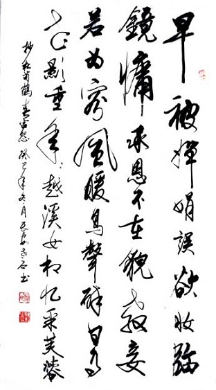 “风暖”这一联设色浓艳,《诗人玉屑》(卷三)把它归入“绮丽”一格。风是“暖”的;鸟声是“碎”的──所谓“碎”,是说轻而多,唧喳不已,洋溢着生命力,刚好与死寂的境界相对立;“日高”,见出阳光的明丽;“花影重”,可以想见花开的繁茂。绮丽而妙,既写出了盛春正午的典型景象,反衬了怨情,又承上启下,由此引出了新的联想。