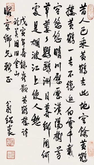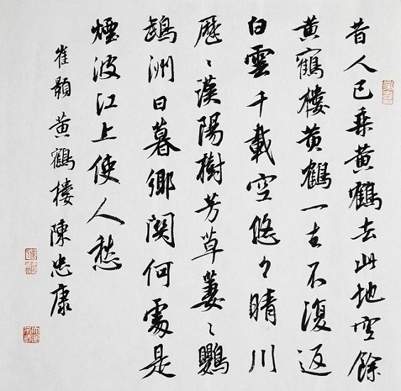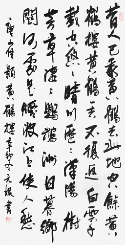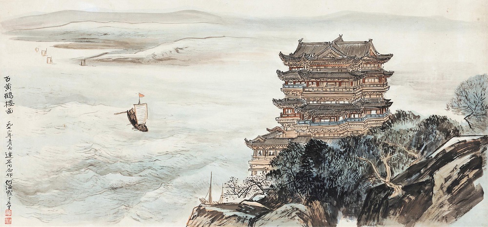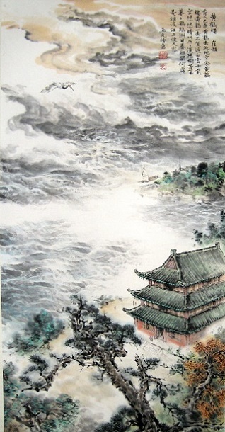 二是气象恢宏、色彩缤纷的绘画美。诗中有画,历来被认为是山水写景诗的一种艺术标准,《黄鹤楼》也达到了这个高妙的境界。首联在融入仙人乘鹤的传说中,描绘了黄鹤楼的近景,隐含着此楼枕山临江,峥嵘缥缈之形势。颔联在感叹“黄鹤一去不复返”的抒情中,描绘了黄鹤楼的远景,表现了此楼耸入天际、白云缭绕的壮观。颈联游目骋怀,直接勾勒出黄鹤楼外江上明朗的日景。尾联徘徊低吟,间接呈现出黄鹤楼下江上朦胧的晚景。诗篇所展现的整幅画面上,交替出现的有黄鹤楼的近景、远景、日景、晚景,变化奇妙,气象恢宏;相互映衬的则有仙人黄鹤、名楼胜地、蓝天白云、晴川沙洲、绿树芳草、落日暮江,形象鲜明,色彩缤纷。全诗在诗情之中充满了画意,富于绘画美。