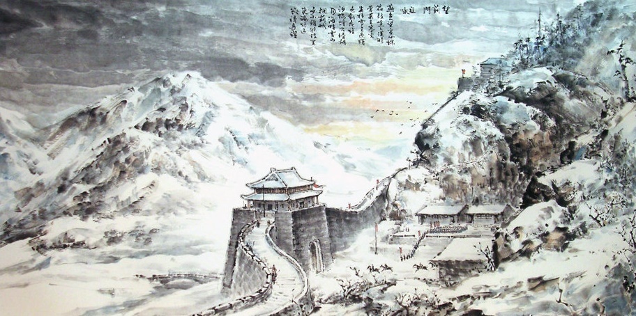 万里积雪笼罩着冷冽的寒光,边塞曙光映照着飘动的旌旗。