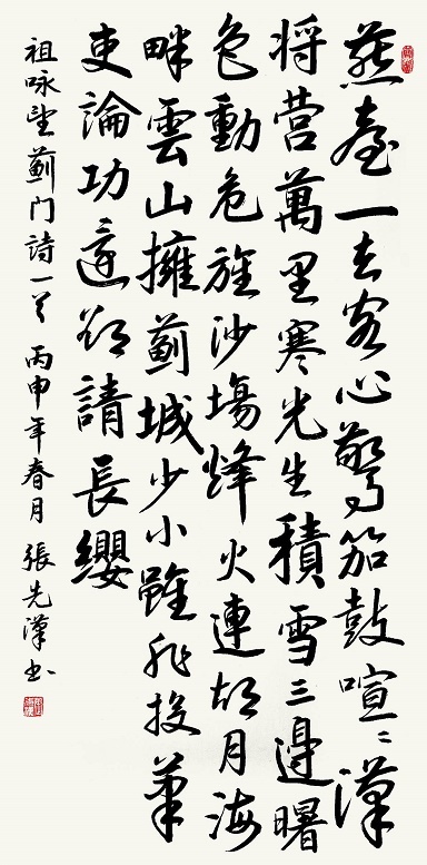 客心因何而惊呢?首先是因为汉家大将营中,吹笳击鼓,喧声重叠。此句运用南朝梁人曹景宗的诗意:“去时儿女悲,归来笳鼓竞。借问行路人,何如霍去病?”表现军营中号令之严肃。但仅仅如此,还未足以体现这个“惊”字。三四两句更进一步,写这笳鼓之声,是在严冬初晓之时发出的。冬季本已甚寒,何况又下雪,何况又是多少天来的积雪,何况又不止一处两处的雪,而是连绵千万里的雪;这些雪下得如此之广,又积得如此之厚,不说它是怎样的冷了,就是雪上反映出的寒光,也足以令人两眼生花。“万里寒光生积雪”这一句就这样分作四层,来托出一个“惊”字。这是往远处望。至于向高处望,则见朦胧曙色中,一切都显得模模糊糊,唯独高悬的旗帜在半空中猎猎飘扬。这种肃穆的景象,暗写出汉将营中庄重的气派和严整的军容。边防地带如此的形势和气氛,自然令诗人心灵震撼了。