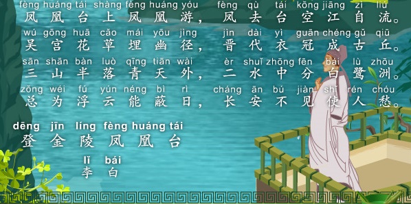 《登金陵凤凰台》是李白集中为数不多的七言律诗之一。此诗一说是天宝(唐玄宗年号,742~756)年间,作者奉命“赐金还山”,被排挤离开长安,南游金陵时所作;一说是作者流放夜郎遇赦返回后所作;也有人称是李白游览黄鹤楼,并留下“眼前有景道不得,崔颢题诗在上头”后写的,是想与崔颢的《黄鹤楼》争胜。