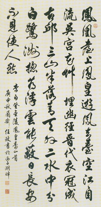 李白《登金陵凤凰台》的艺术特点,首先在于其中所回荡着的那种充沛、浑厚之气。气原本是一个哲学上的概念,从先秦时代起就被广泛运用。随着魏晋时期的曹丕以气论文,气也就被当做一个重要的内容而在许多的艺术门类里加以运用。虽然,论者对气的理解、认识不完全相同,但对所含蕴的思想性情、人格精神与艺术情调,又都一致认同。李白《登金陵凤凰台》中明显地充溢着一股浑厚博大之气,它使李白观古阅今,统揽四海于一瞬之间,且超然物外,挥洒自如。浑厚博大之气使李白渊深的思想,高妙的见解,阔大的心胸,成为编织巨大艺术境界的核心与精神内含。就像透过“三山半落青天外,二水中分白鹭洲”的巨大立体时空,可以感受到历史的脉搏跳动与诗人的呼吸一样,通过李白的举重若轻,从容自在,以浩然雄大之气充塞整个诗歌境界的努力,也能更进一步感受到他整个诗歌以气夺人的艺术特点。