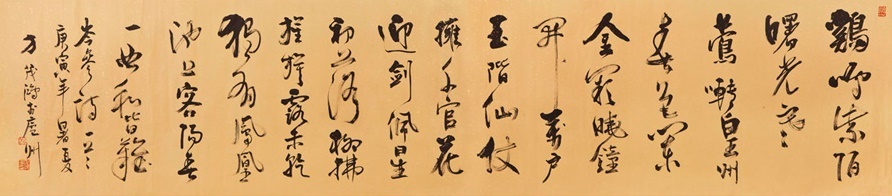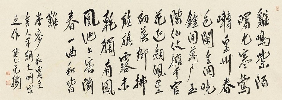 其二曰“辞藻典丽堂皇”。岑参虽尚奇丽,但并不排斥典丽堂皇之语。在岑参此诗中,虽然有若于奇险之韵脚,但也有不少典丽堂皇之造语,其例如“紫陌”、“皇州”、“金阙”、“玉阶”等,绝不亚于其他三诗。早朝诗毕竟要写宫廷气象,若一味追求奇险就有可能破坏诗中画面的和谐。岑诗虽押险韵而未过份,又用了若干典丽堂皇之辞藻表现宫廷气象,恰到好处地取得了平衡。其诗虽奇而又未离格,达到了奇不离正,正中有奇,得心应手的境界。