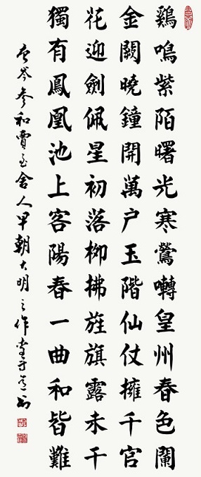 杜甫、王维、岑参三首和《早朝大明宫》,其艺术成就都超过了贾至的原作。在诸和诗之中,杜甫的和诗以其格律谨严而著称,王维的和诗以其气象阔大而驰名,至于岑参的这首和诗,则以其押韵奇险、属对精工与用语之典丽而深获历代论者之盛誉。