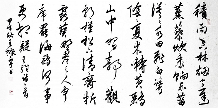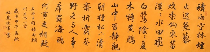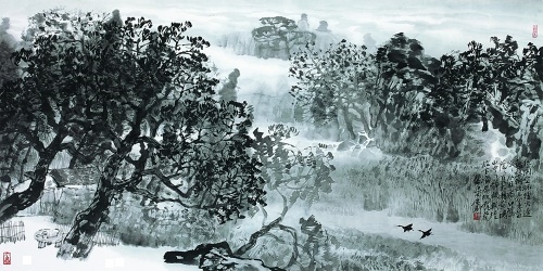 颔联写自然景色,同样是诗人静观所得:“漠漠水田飞白鹭,阴阴夏木啭黄鹂。”辋川之夏,百鸟飞鸣,诗人只选了形态和习性迥然不同的黄鹂、白鹭,联系着它们各自的背景加以描绘:雪白的白鹭,金黄的黄鹂,在视觉上自有色彩浓淡的差异;白鹭飞行,黄鹂鸣啭,一则取动态,一则取声音;漠漠,形容水田广布,视野苍茫;阴阴,描状夏木茂密,境界幽深。两种景象互相映衬,互相配合,把积雨天气的辋川山野写得画意盎然。所谓“诗中有画”,这便是很好的例证。