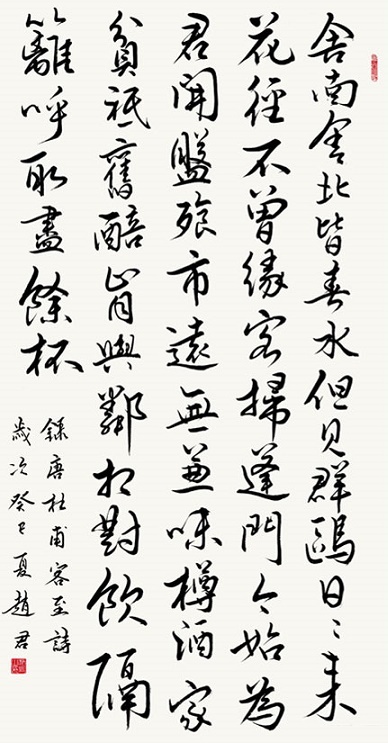 首联先从户外的景色着笔,点明客人来访的时间、地点和来访前夕作者的心境。“舍南舍北皆春水”,把绿水缭绕、春意荡漾的环境表现得十分秀丽可爱。这就是临江近水的成都草堂。“皆”字暗示出春江水势涨溢的情景,给人以江波浩渺、茫茫一片之感。群鸥,在古人笔下常常作水边隐士的伴侣,它们“日日”到来,点出环境清幽僻静,为作者的生活增添了隐逸的色彩。“但见”,含弦外之音:群鸥固然可爱,而不见其他的来访者,也是过于单调。作者就这样寓情于景,表现了他在闲逸的江村中的寂寞心情。这就为贯串全诗的喜客心情,巧妙地作了铺垫。